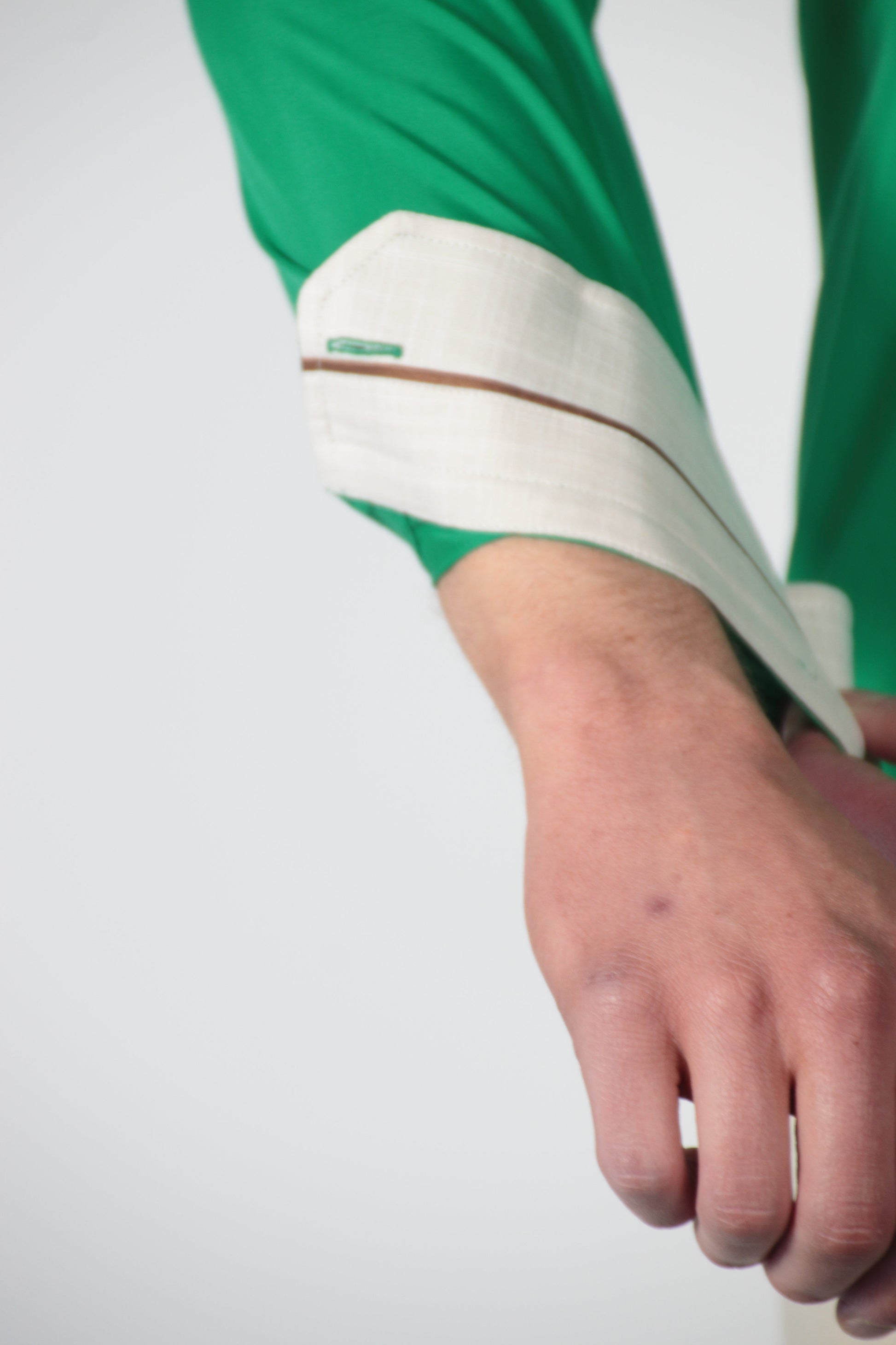 - Gedetailleerde afwerking: Kleuren komen terug in de binnenkant van de kraag en manchetten.